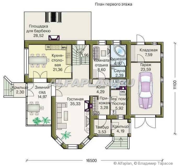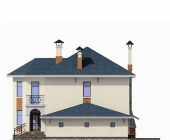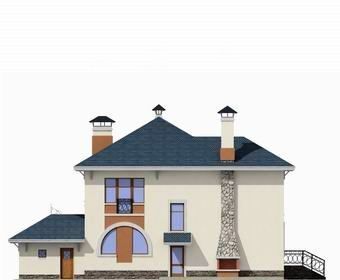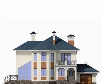 Облик дома формирует мощный трехгранный эркер главного фасада. В доме два полноценные по высоте этажа. На первом этаже удобно скомпонованы помещения дневного пребывания семьи и зона релаксации. Комфортность планировке придают зимний сад и открытая терраса-барбекю.