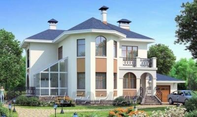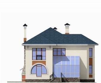 В дом ведет небольшое крылечко и остекленный тамбур, они оформлены изящными арками. Основные помещения первого этажа - гостиная и кухня-столовая. При желании можно отказаться от разделяющей их перегородки и получить единое гостевое пространство. Удачно решение зимнего сада. Он расположен таким образом, что доступ в него есть и из гостиной и из кухни.