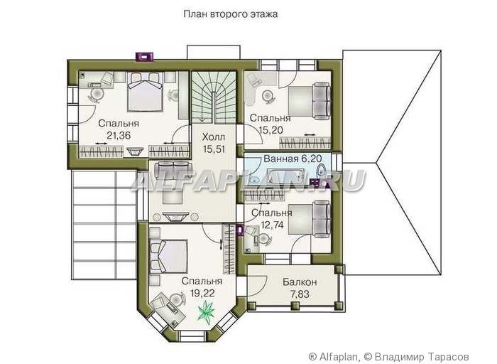 Приятно дополняет планировку дома и площадка барбекю с камином. На втором этаже расположены четыре спальни и небольшая ванная комната. В холле можно поставить диван и телевизор. К дому пристроен одноэтажный гараж.